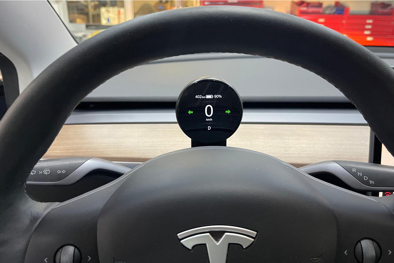 Das kompakte Zusatzdisplay zeigt alle wichtigen Fahrinformationen direkt im Blickfeld ohne den Blick nach rechts auf das zentrale Tesla-Display richten zu müssen. Geschwindigkeit (km/h oder mph), Akkustand in %, Reichweite, Blinker rechts/links, eingelegter Gang und Parkmodus werden klar und übersichtlich dargestellt.